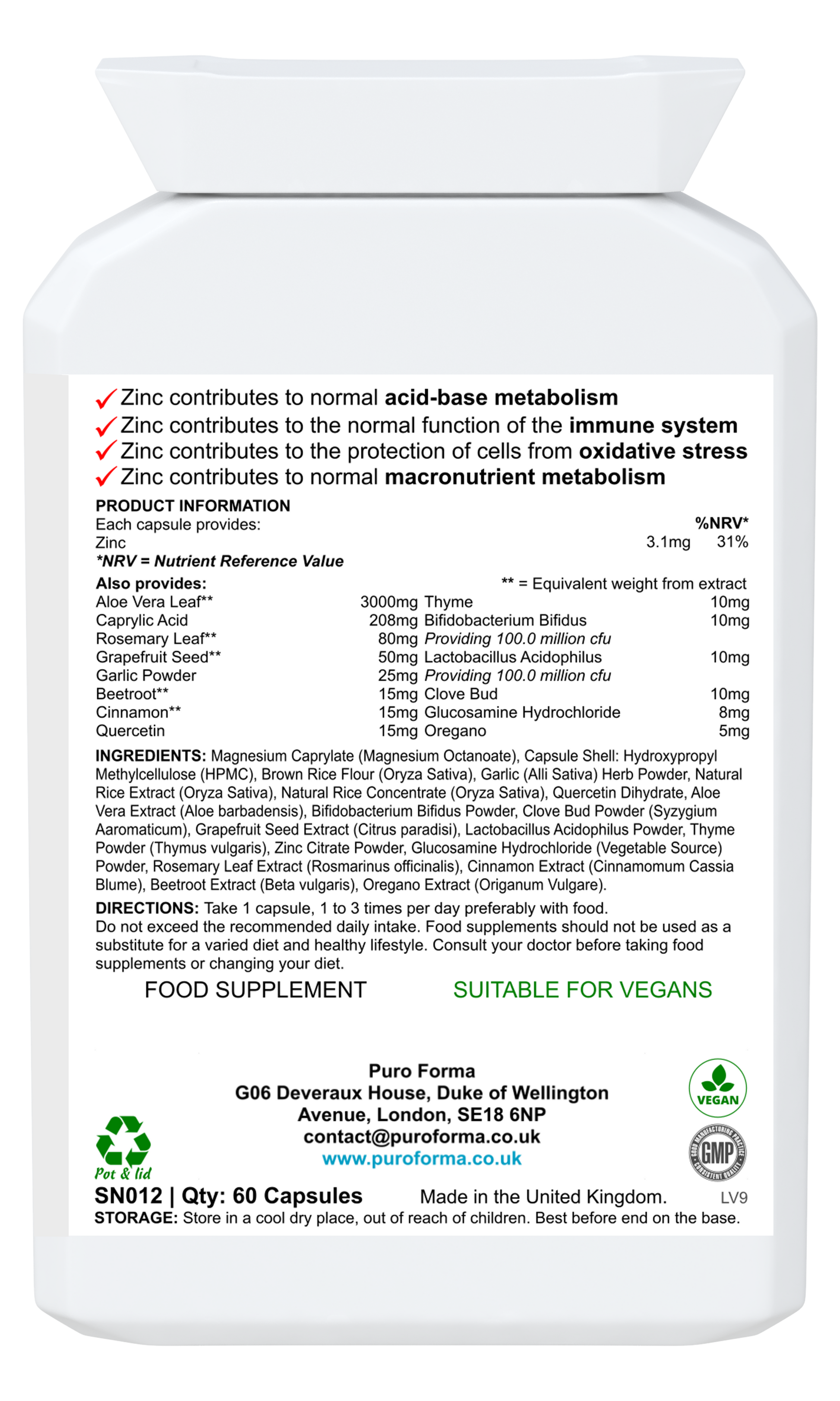 Magnesium Caprylate Powder, Stoneground Brown Rice Flour (Gluten Free) (Oryza Sativa), Capsule Shell: Hydroxypropyl Methylcellulose (HPMC), Garlic Powder (Alli sativa), Cinnamon Powder (Cinnamomum Zeylanicum), Quercetin Dihydrate, Zinc Citrate, Aloe Vera Leaf Extract (Aloe barbadensis), Clove Bud Powder (Syzygium Aaromaticum), Grapefruit Seed Extract (Citrus paradisi), Thyme Leaf Powder (Thymus vulgaris), Glucosamine Hydrochloride (Vegetable Source) Powder, Rosemary Leaf Extract (Rosmarinus officinalis), Oregano Leaf Powder (Origanum Vulgare), Beetroot Extract (Beta vulgaris), Lactobacillus